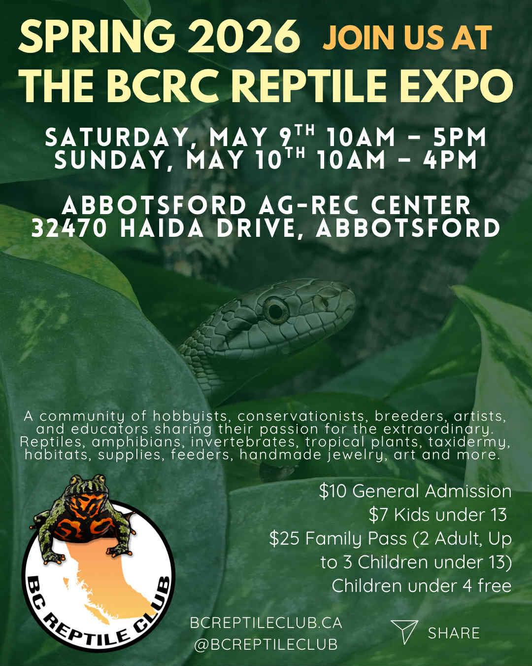 Mark your calendars for May 9th and 10th 2026 to make sure you don’t miss the BIGGEST and LONGEST RUNNING Reptile Expo in British Columbia!